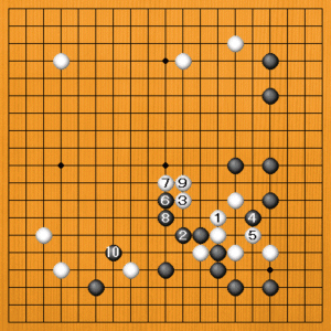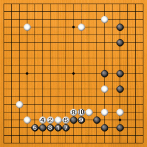 黒1(B)の下ツケも失敗です。白2のノビから4と止めて、6のブツカリから10のツギまで、白が厚くなります。