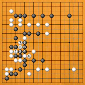 続いて、白1、3の出切りが心配ですが、黒4がアタリになっていますから、白5に黒6から8とオサエ込んで取れています。左下の白も危ないし、黒の先制攻撃が成功しました。