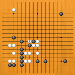 白1(A)のシマリは大きな手ですが、この場面では最善ではありません。左下から中に出ている黒は、すでに根拠がありますから、白1の手が黒に対してあまり響かないのです。
