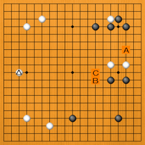 白が△とヒラいたところです。次の一手を、A~Cの選択肢の中から示してください。