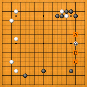 黒1(C)のシマリは、方向はいいのですが、白に響きません。白2とヒラいて、白は安心します。ゆっくりした碁になるでしょう。黒1は正解に比べて、迫力が足りませんでした。
