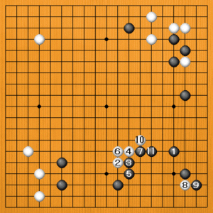 黒1に白2のボウシから消してくれば、黒3、5とツケ引いて、右下を大きな地にします。白8のツケには黒9とハネて全部取ってしまいましょう。