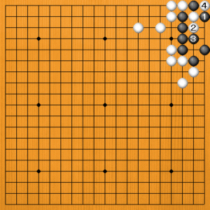 黒1には白2と逃げる余裕があります。黒3に白4と抜いてコウです。白2はコウ材として使えるのです。