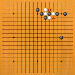 黒1(B)が正解です。白2と取られますが、黒3とオサえてコウの形です。これで白の出口を止めることができました。白4のハネに黒5とコウを取ります。黒7とノビて白8のトビまでで一段落です。