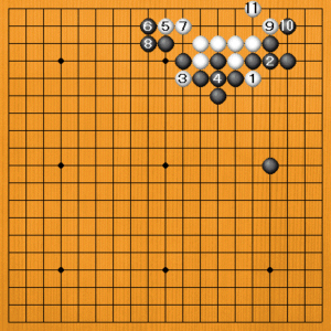 白1の切りから3と切るのが手筋です。黒4のツギは絶対です。白5、7のツケ引きから11まで白は生きますが、黒は外側を厚くして、十分満足できる姿です。