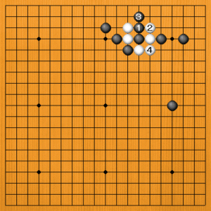 黒1(B)と逃げるのは失敗です。白2のアテから4とツガれて、黒が割かれ形になっています。