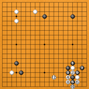 黒1とハネる型もあります。白2のブツカリから4と切ってきますが、黒5と二子にして捨てます。黒7のケイマが形で、黒11のホウリコミに白12とヒラいて一段落です。黒は中央から上辺に厚い形です。白は右辺に変化しました。