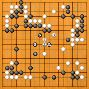 黒1の後、白2のツケに黒3とトベば、左辺の黒の厚みは囲うことができます。しかし、白4から6とこっちを打たれると、黒△の石が飲み込まれて、白地も大きく増えてしまいます。正解図は、黒が一方的に厚みを地にしていますから、だいぶ違っています。
