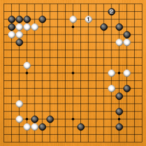 白1に黒2の方から動いてくるなら、白3と三々に入ります。隅を荒らせば、白が満足です。