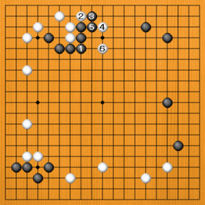 黒は上辺を地にしたい局面です。黒1(A)のカケツギは、いかにもよさそうな手ですが、この形には弱点があるのです。白2とハネられたときに、黒3とオサえることが出来ません。白4と切られて困っています。黒5とカカえても、白6と逃げられてつかまりません。