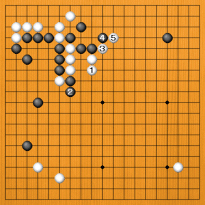 白1に黒2とノビてくれば、白3、5と二段にハネるのが強烈です。黒は苦しい姿になりました。