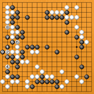 白1から黒模様を削減するヨセを打っているように見えますが、黒4まで換わってから白5、7と黒一子を取ったのには狙いがあります。黒8に白9とハネて分断したあとがテーマです。