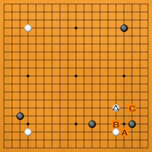 黒1(C)のトビは従来の手です。白2のコスミを決めて4とハサめば普通です。白2を保留すると複雑な変化になります。 |