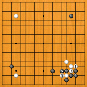 黒1には白2とコスむのが有力です。黒3のハネは白4と切られてまずいですから、黒も変化が必要です。 |