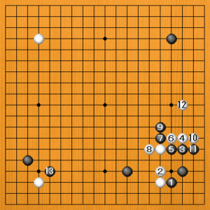 黒2のブツカリが形です。白3のハネには、黒4とオサえます。白5とカカえて、黒6の切りから10とツイで一段落です。これは互角の変化です。一時期よく打たれていました。 |