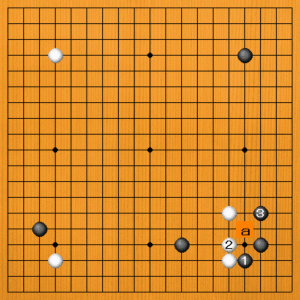 (新手) 黒1(A)のコスミツケが新しい手です。白2と立たせて、黒3と一間に構える作戦です。黒1は今がタイミングで、先に黒3と打ってから後で1とコスミツけても、白2と受けてくれるとは限りません。白aとノゾかれそうです。黒1から3はやや働いた打ち方ですから、白も2の手では工夫することになります。 |