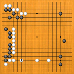 (正解) 白1(B)と一間に構えるのが正解です。これで弱点が消えて、白模様が完璧になりました。大きな地が見込めるでしょう。黒からは模様を荒らす手掛かりが消えて、難しい碁になっています。 |