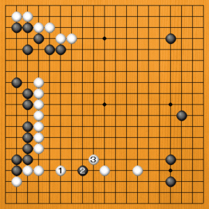 白1に黒2と深く打ち込んでくれば、白3とコスんで取りに行きます。黒は左側に逃げても白の壁に阻まれますから、うまいサバキは望めません。 |