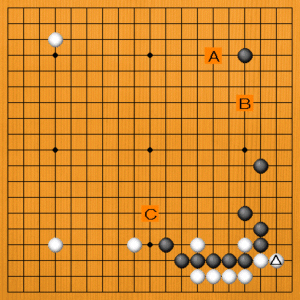 白△とサガったところです。黒が厚くてやや優勢と思われます。次の一手を、A~Cの選択肢の中から示してください。 |