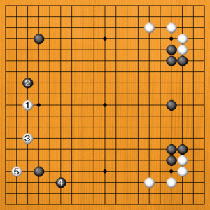 黒2の詰めには、白3と二間にヒラくのも分かりやすい打ち方です。黒4のケイマに白5とスベって安定します。 |