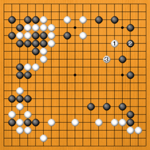 白1に黒2と受けてくれれば立派な利かしです。白3とボウシして、黒模様を減らしながら中央の白を広げます。 |