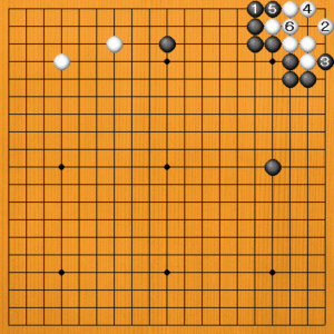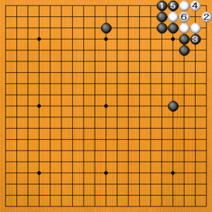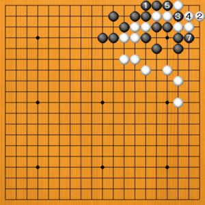 (手順) 黒が小目からシマっている形には、白1のツケから7のカケツギまで、隅で生きようとする手順があります。この白がどうなるか、考えてみましょう。 |