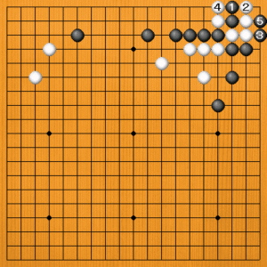 黒1に白2からオサえるのも、黒3とハネれば死んでいます。白4とオサえることはできますが、黒5と三子にして捨てればナカ手になります。 |