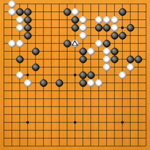 (失敗の原因) A=黒1のオサエが失敗の原因でした。黒1の前に大事な手があったのですが、それは後ほど説明します。 |