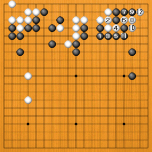 初めに戻って、黒1のノビから3、5とオサえる変化も見てみましょう。これも白6と切られると、黒陣が敗れてしまいます。黒7と下からアテて9とハウのは、白10のアテが利きますから12とオサえられて黒が取られてしまいます。 |