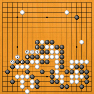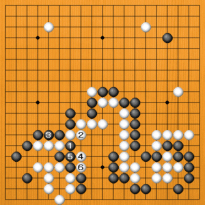 (追及の手) 黒1のノビから3とケイマに外すのが好手です。白4のブツカリから6とハネてきても、黒7とハネ返して追及が止まりません。ただし、この後もしっかりヨミ切らなければなりません。 |