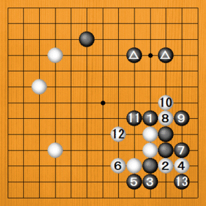 (手順) 前問の続きです。黒9の下ツケに対して、白10、12とナダれてきた所です。 |