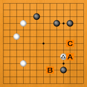 白がナダれて△をオサえた場面です。黒番で候補手A・B・Cのどこに打ちますか? |
