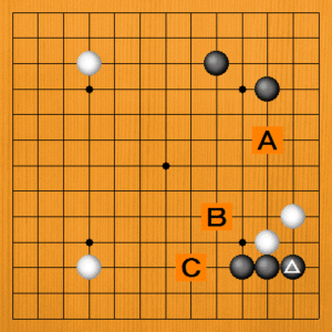 黒△に対して白はどう応じるべきですか? 白番で候補手A・B・Cのどこに打ちますか? |