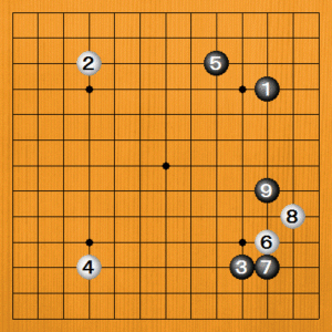 (手順) 黒1から5の布石に、白6、8と打ってスコップ定石が出現しました。黒は9とサガった場面です。 |
