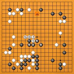 (1図) 白1(A)のボウシは不正解です。黒2のトビに白3と攻めても、黒4の肩ツキから黒6、8と受けられて、なかなか黒の眼を奪えない形です。黒aなどの薄みも残り、これは白の大変な進行です。 |