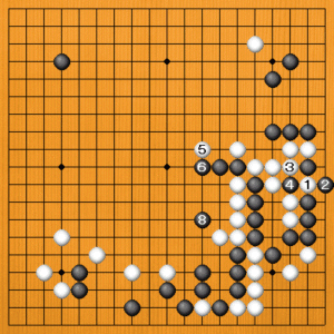 (6図) そこで、5図の白8では白1、3とコウにしてきました。白5のコウダテから白7と取り返されましたが、今度は黒8と中央の白を狙うコウダテがあります。 |