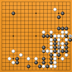 (7図) 続いて、もしも白9とコウを解消したら黒10と詰めます。白11とホウリ込む手筋はありますが、黒12、14と受けて攻め合いは黒の一手勝ちです。 |
