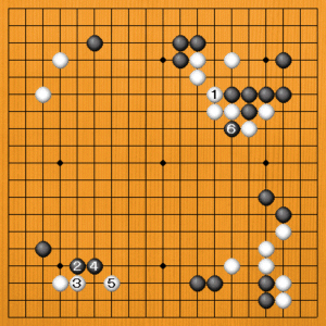(7図) 実戦の進行は黒1に白2とノビました。黒3、5のワリツギが手厚い手です。 |