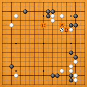 白△とトンだところです。この局面で、候補手A・B・Cのどこから打ちますか? |