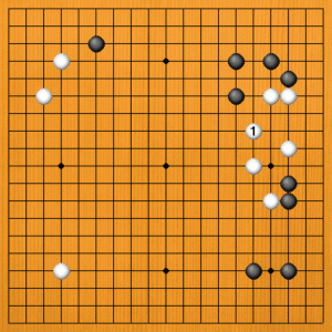 (2図・正解図) 白1(A)が100点の手で正解です。ここを守るのが大事なところで、白1と打つことによって白全体が安定します。 |