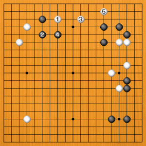 (5図) 白1(B)の手は60点です。ただ、黒2、4と左上を逃げてくれれば、白3、5と上辺を荒らして、白にとって理想的な展開になります。 |