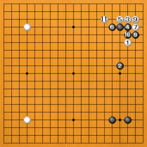 (11図) 黒1のサガリには白2とケイマしてくるような手もあります。黒3、5と出切ると白6で両アタリです。いずれにしても右辺を突破されてしまうと少し黒が薄くなってしまうので、黒1は60点です。 |
