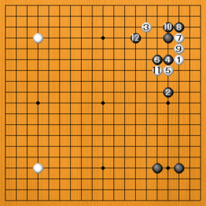 (3図) そこで、白1のカカリには黒2とハサみたいところです。以前はここで白3から7までと根拠を作るのが定石となっていたのですが、最近は打たれなくなりました。 |