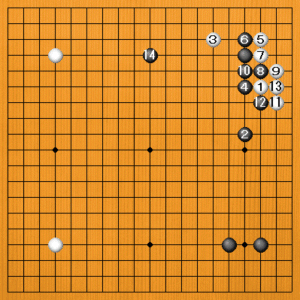 (3図) 白5の三々入りに対して、黒は6とこちらからオサえるのもあります。白7には黒8、10のワリツギが簡明で、黒14までとなります。黒は上辺を大事にする進行です。 |