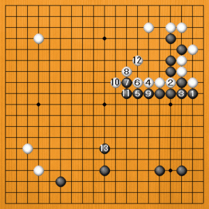 (6図・正解図) 黒1(B)のハネが100点で正解です。白2と切られてしまいますが、黒3とツギ、白4のノビに黒5とカケて右上の黒四子を捨ててしまいます。白12までとなったあとに、黒13とトベが右辺から下辺にかけて大きな黒地が完成します。豪快で気持ちのいい打ち方です。 |