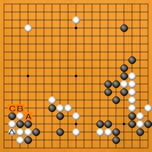 白△とツイだところです。この局面で、候補手A・B・Cのどの手を選びますか? |