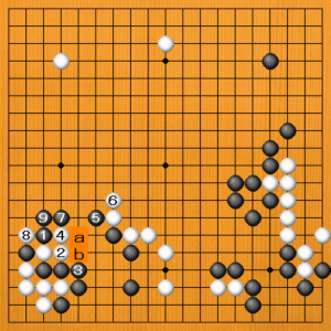 (7図) 黒1から5に対しては白6とノビるくらいですから、黒7とハネて白3子のダメを詰めます。白8の切りには黒9とツイで、白をダメヅマリにした効果で、後に黒aやbが利いて黒は非常に厚い形になるので、黒十分の進行となります。 |