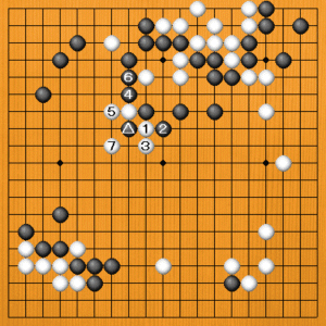 (7図) 白1(C)の切りは不正解です。しかし、黒2、4から黒6と上辺の白を取ってくれれば、白7のゲタで黒△を取ることができるので、本図は白に不満はありません。 |