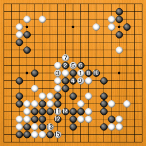 (手順図) 私の白番です。白1のハサミツケが狙いの一手。、黒2には白3、5と踏み込みます。黒6の切りで取られてしまうのですが、白11、黒12となった後で、白から鋭い狙いがあります。 |