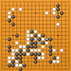 (3図) 続いて白17と取り、黒18と中央を取らせたときに、白19の放り込みが攻手です。 |
